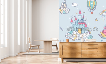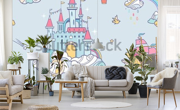 Tapeta Dla dzieci jednorożce z bajki, zamek, tęcza