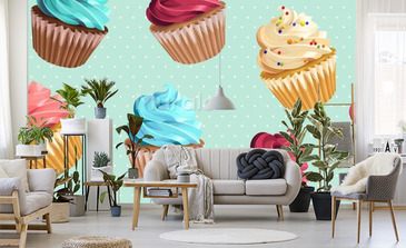Tapeta Retro - Kolorowe Babeczki na Miętowym Tle
